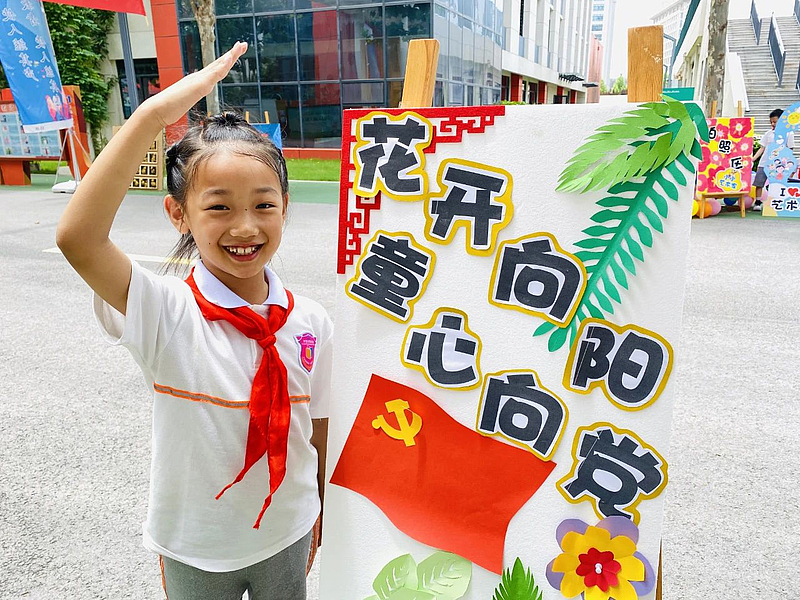 活動現(xiàn)場,少先隊員們手拿畫筆,用靈巧的雙手在百米畫卷上創(chuàng)作,從畫面的構(gòu)思到色彩的搭配,每一個步驟都一絲不茍。大家以畫傳情、以畫抒志,用五彩斑斕的色彩描繪祖國波瀾壯闊的歷史畫卷,一筆一畫深情地表達出對黨和祖國的美好祝愿。經(jīng)過2個小時的精心繪制,一幅幅飽含深情的作品呈現(xiàn)在大家眼前,訴說著“我的童心永向黨,我的愛心獻祖國”的心聲。